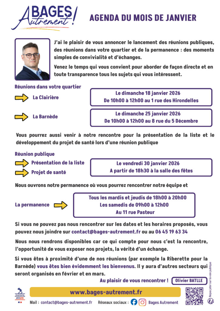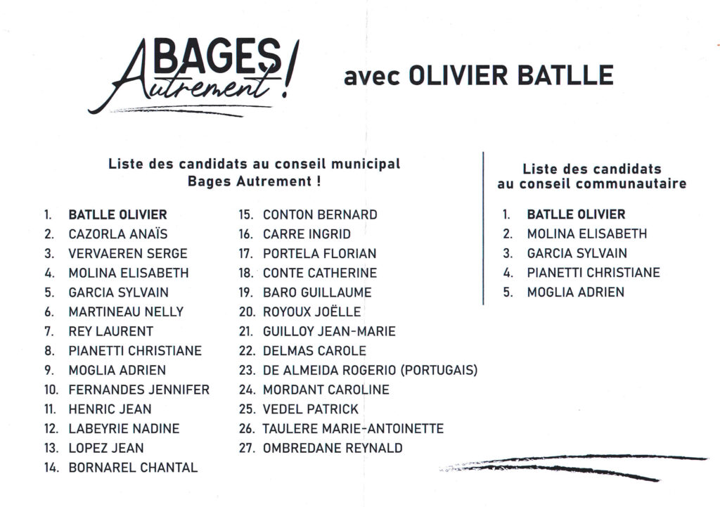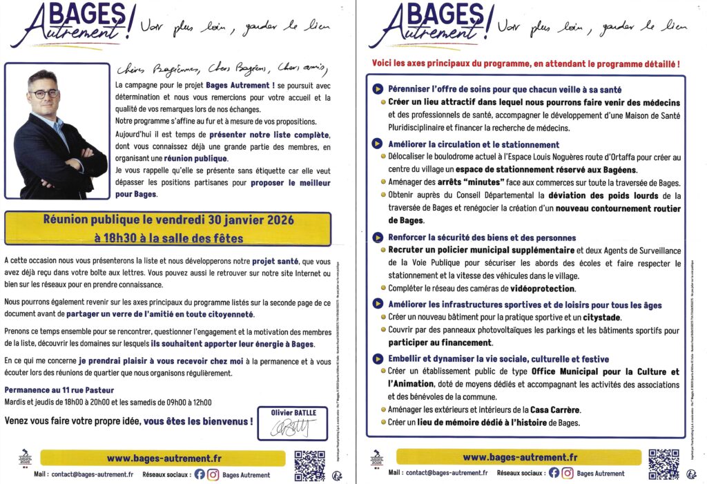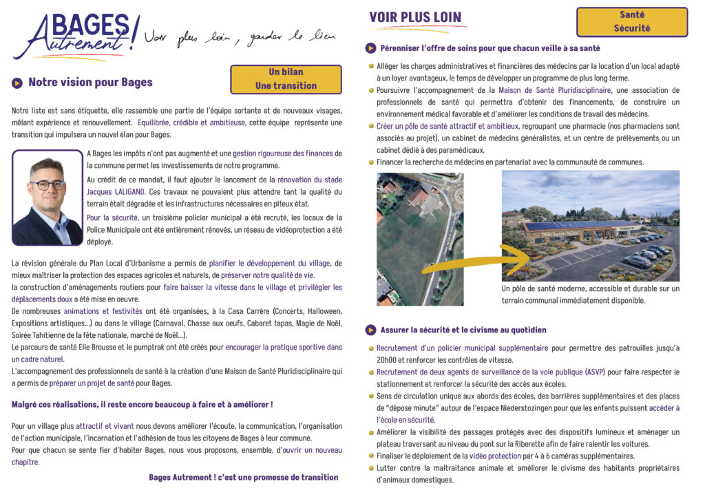 Aujourd’hui, je souhaite aller plus loin et poursuivre le travail commencé. C’est pourquoi j’ai choisi de faire confiance à Olivier : nous partageons la même vision, et il a l’expérience nécessaire pour occuper la fonction de maire. Ensemble, nous voulons mettre en œuvre les changements indispensables et porter une ambition claire : faire de Bages une ville plus dynamique et plus proche de ses habitants.