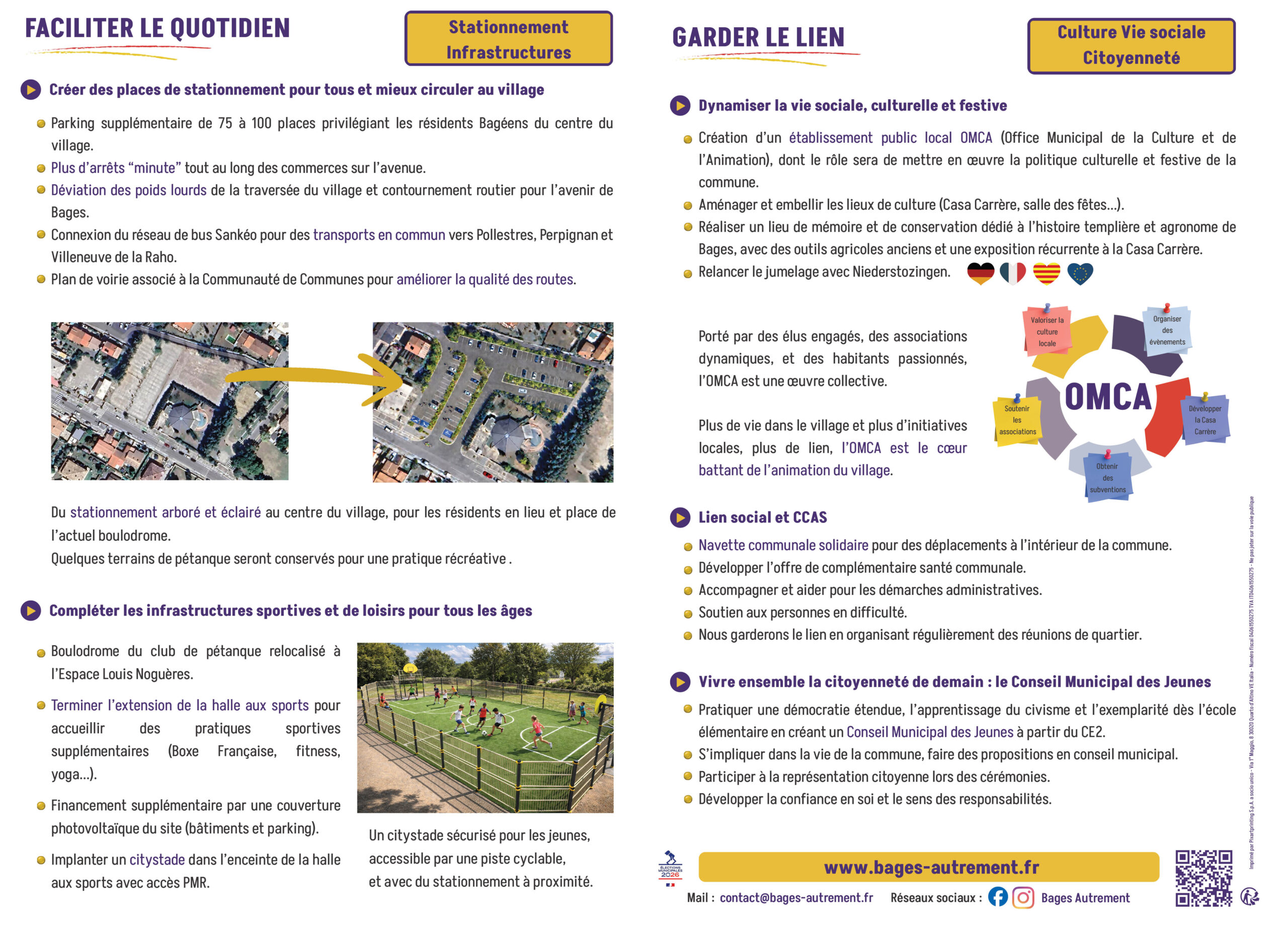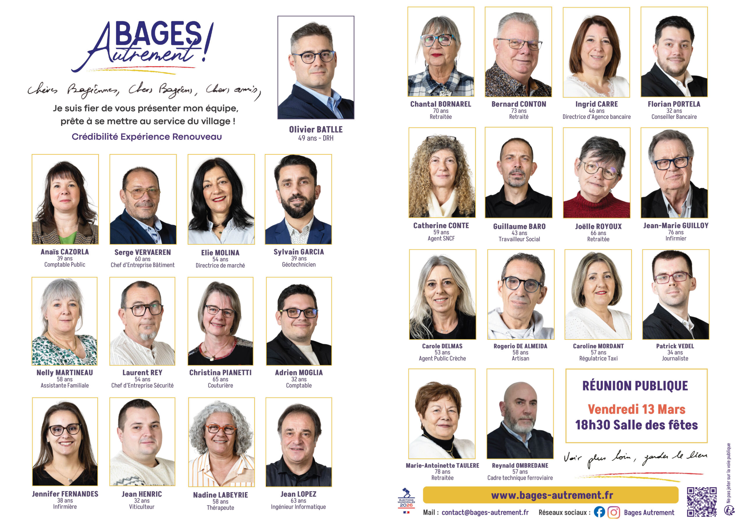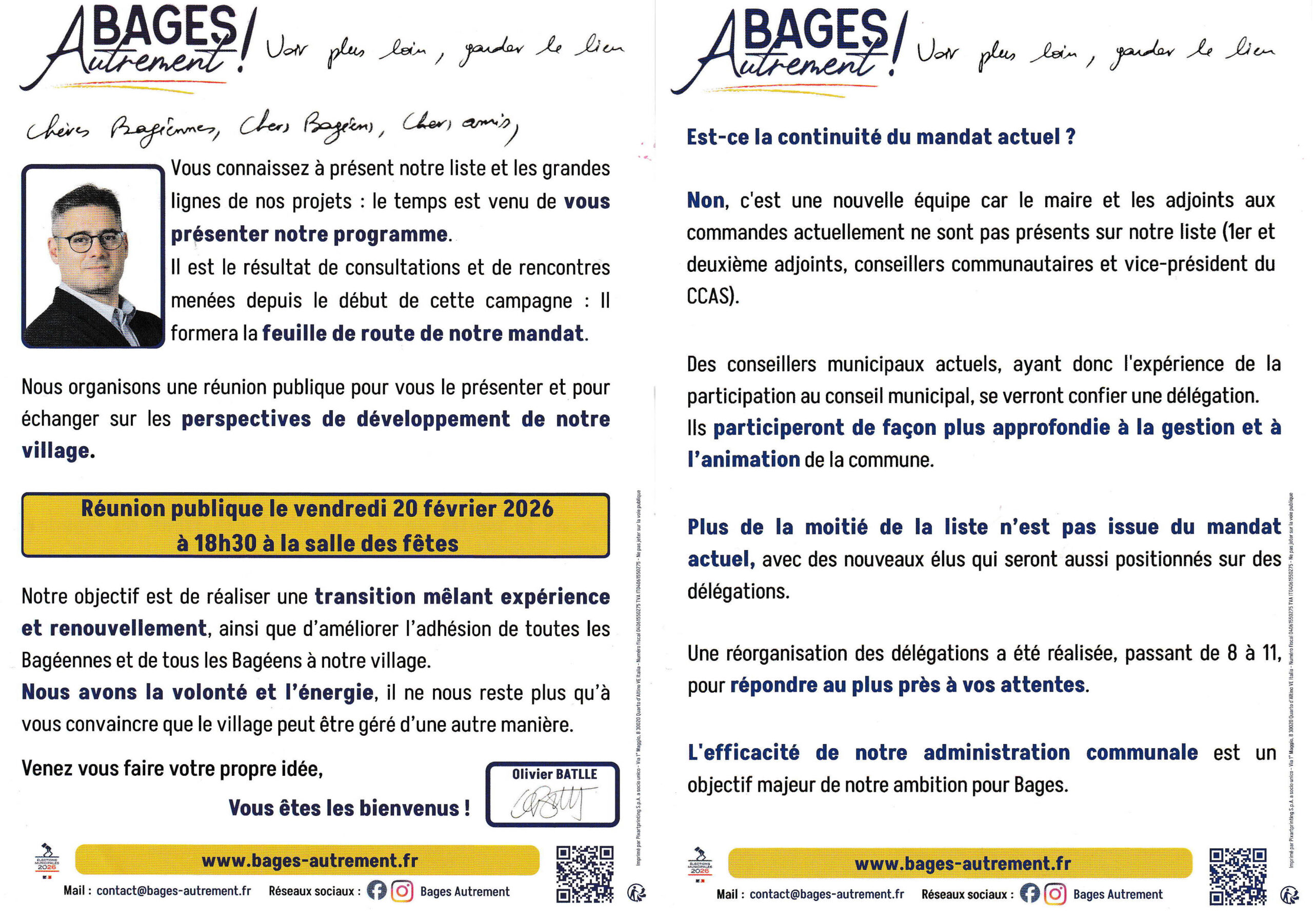 Aujourd’hui, je souhaite aller plus loin et poursuivre le travail commencé. C’est pourquoi j’ai choisi de faire confiance à Olivier : nous partageons la même vision, et il a l’expérience nécessaire pour occuper la fonction de maire. Ensemble, nous voulons mettre en œuvre les changements indispensables et porter une ambition claire : faire de Bages une ville plus dynamique et plus proche de ses habitants.